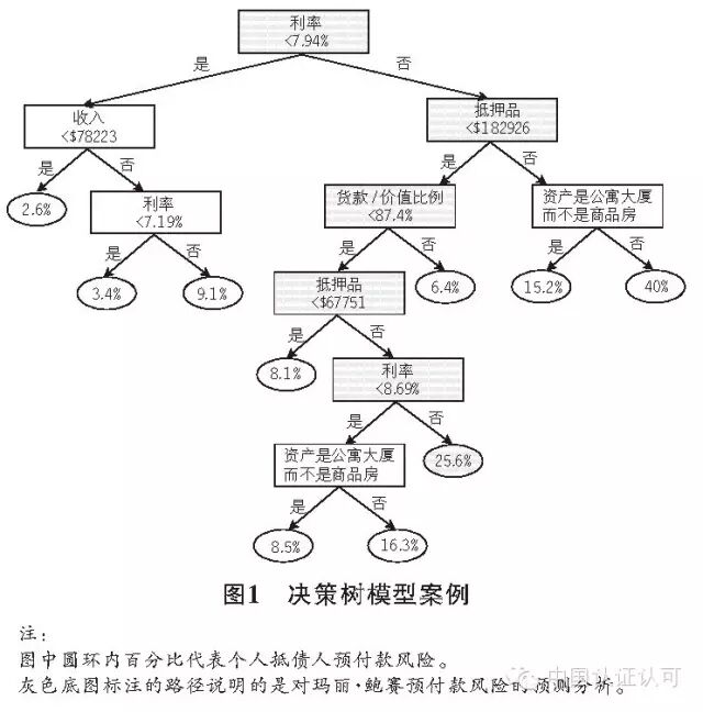 為了預(yù)測(cè)一個(gè)抵債人預(yù)付款風(fēng)險(xiǎn),每一個(gè)案例采取由高至低倒樹狀形式,并通過一系列試驗(yàn)來(lái)測(cè)算,直到做出相應(yīng)決定為止。例如,這一模型預(yù)測(cè)抵債人瑪麗·鮑賽(Mary Bowser)有26.5%傾向來(lái)預(yù)付其抵押。這一預(yù)測(cè)是基于其數(shù)據(jù):利率為8.8%、100000美元抵押及80%貸款/價(jià)值比率。針對(duì)瑪麗·鮑賽這一案例的預(yù)測(cè)分析路徑如圖1所示。